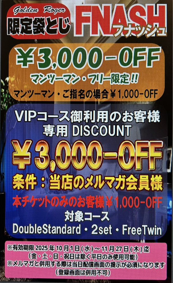 - 2025.10 更新9月に配布した袋とじチケットは本日、御利用できます!!袋とじチケット【マンツーマン30分】ご指名 ¥1,000-OFFフリー ¥3,000-OFF【フリーツイン】【2SET】【ダブルスタンダード】チケットのみ ¥1,000-OFFメルマガ併用 ¥3,000-OFFメルマガを登録してお得に遊びましょう!!