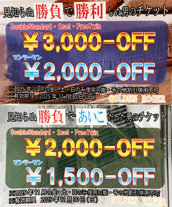 2025.11.18 更新『緊急MISSION』【じゃんけん対決】で限定チケットをGetせよ!!11月月間コスプレ火曜日の本日は...♨バスタオル♨秋といえば行楽の秋行楽といえば温泉旅行男なら一度入ってみたい混浴温泉バスタオル一枚の女の子がすぐそこにいるただそれだけで大興奮その女の子がスススとあなたに近寄って肌と肌が触れ合っちゃうそんな事があった日には温泉のお湯が真っ赤な鼻血で染まっちゃう😎そんな妄想をしつつバスタオル姿の女の子と楽しく遊びましょう👍️ゴールデンロジャーで素敵な疑似温泉体験を船橋で最も素敵な45分ダブルスタンダード女の子がふた〜りあっちからこっちから攻めの魔の手が迫りますB地区もヤシの木もヤシの実もぜ〜んぶ同時に攻められちゃうなんて素敵な時間でしょう男なら一度はやってみたい夢の3P思いついた今日がヤるべき日です💕ぜひぜひ楽しんじゃってくださいね〜😇